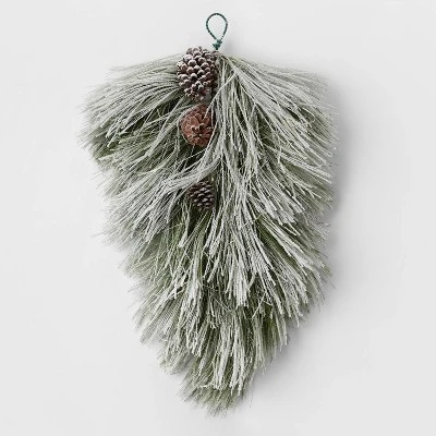 You’ll love the snow-covered look of this Pre-lit Flocked Long Needle Pine Artificial Christmas Swag with Warm White Dewdrop LED Lights from Wondershop™. Showcasing flocked long-needle pine greenery, pinecones and warm white LED dewdrop lights, this pre-lit artificial Christmas swag is ideal for hanging on a door and is powered by batteries, so placement is easy. Simply hang in an indoor or sheltered outdoor space for a beautiful accent to your holiday decor.