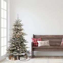 “Bring the holiday spirit into your home with the Puleo International 4.5′ Slim Flocked Aspen Fir Artificial Christmas Tree. This pre-lit artificial tree features hinged, flocked green branches and 200 clear incandescent lights to brighten your home for a dazzling Christmas display. With life-like pine needles and a realistic appearance, this artificial tree is sure to add warmth to any room or space for years to come. The included sturdy metal base will safely and steadily support your tree and decorations. Plus, if one bulb burns out, the rest remain lit. Constructed from flame-retardant and non-allergenic materials, this tree provides a safer alternative to real trees. The Aspen Fir Tree with 200 lights measures 54″” tall x 26″” in diameter and weighs 22 lbs., allowing for easy placement and versatile Christmas decorating anywhere in your home.