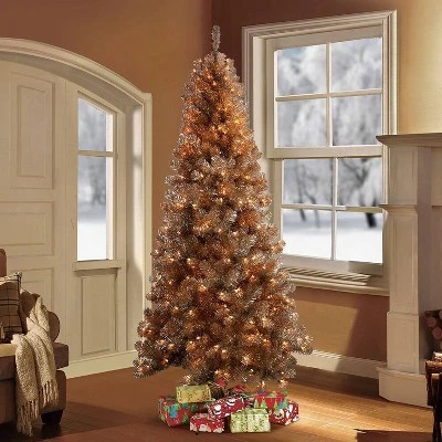 Deck the halls with the Puleo International 6.5-foot Rose Gold Tinsel Artificial Christmas Tree. Inspired by lush wintry forests, this artificial tree has 1003 branch tips and 400 Incandescent Clear Lights. The incorporated lights means no more climbing ladders to string lights, saving decorating time. When a single bulb burns out, the other lights on the strand will stay lit for your convenience. We recommend changing the burnt bulb to prevent future outages. Hypoallergenic and needle-shed resistant, the tree is an great alternative to a yearly real tree purchase. With easy to assemble pieces and an included base, your house will be ready for the holidays faster than you can say “Rockin’ Around the Christmas Tree”. Measures. 6.5 Foot High x 38 Inch Diameter. lbs