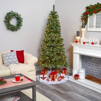 Create the ultimate holiday scene in your home or office with the help of this 7ft. Wisconsin Slim Snow Tip Pine Artificial Christmas Tree with 400 Clear LED Lights by Nearly Natural; entirely maintenance-free, this realistic looking Christmas tree boasts a rich collection of pine foliage made up of 652 easy-to-bend branches to hang all of your favorite holiday ornaments. Arriving pre-strung with 400 clear LED lights to eliminate tangles and stabilized on a metal stand, this handsome 7’ tall Christmas tree will not only make holiday decorating a breeze but ensure your home is always holiday-dressed for years to come.
