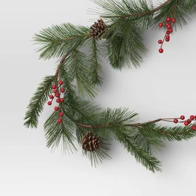 Keep your festive decor green without the upkeep with this Artificial Garland Long Needle Pine with Red Berries from Threshold™. This 72-inch artificial garland features a long needle pine design with pinecones and red berries to bring lovely texture to your space, while loops at either end make it easy to hang and display. Suitable for indoor spaces, simply drape it over your fireplace, porch railing, front door or fence to amp up the festive season.
