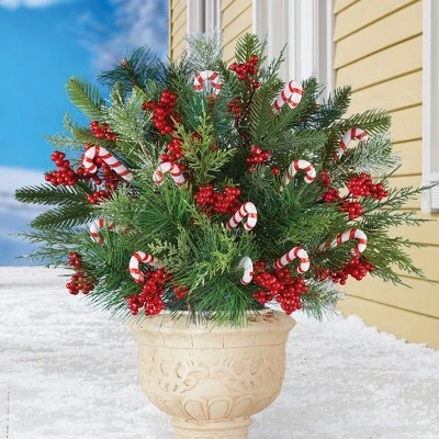 This festive display includes 3 bushes of frosted pine accented with red berries and colorful candy canes. Display the 3 bushes together or separately, in your pots or baskets, or stake them into the ground in your garden. Use separately for smaller bouquets or all together for a festive arrangement (as shown). Vase not included. Plastic. Each is approx. 9″Dia. x 17 1/2″H. Set of 3.