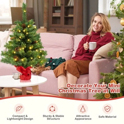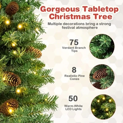 - A Vibrant Must for Christmas – The tabletop Christmas tree is composed of 75 branch tips in a lush manner, where 8 realistic pine cones are evenly distributed. Because of that, the entire tree looks more real. Besides, the PVC material it uses is fireproof, non-allergic and non-fading, highly ensuring the using safety for both adults and kids.