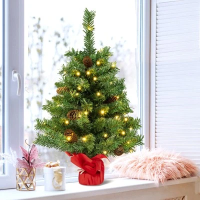 Our small and exquisite tabletop Christmas tree measures 16″ x 25″ (Dia. x H) , which is suitable for decorating the tabletop, mantel, or limited area, adding an instant Christmas spirit to your home. It features 75 verdant branch tips and 8 cute pine cones, which are as vivid as just came out of the forest. And the Xmas tree has pre-strung with 50 LED lights, providing warm and soft lighting on Christmas night. There also exist 8 beautiful lighting modes, allowing you to appreciate with family and friends at ease. To ensure safety, the leaves are made of non-flammable PVC material and the base is constructed of sturdy cement. And the outside of the base is wrapped with a festive red cloth bag to cover the unsightly base. Whether as tabletop decor, home decor, party decor, or commercial decor, it can be a highlight of your holiday!