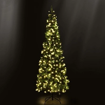 This is our 6.5 ft pre-lit pencil Christmas tree which is designed with 708 branch tips to offer a realistic and lush appearance. Pre-installed with 250 warm white LED lights, the slim tree saves you the hassle of hanging up the lights and help light up your room. It is effortless to make the tree fluff due to its hinged construction, while also facilitating its assemble and storage. Foldable X-shaped iron stand with foot pads prevents breakage and enhances the balance of the tree, offering stability to keep the wondrous tree standing all year around. Whether for your home, courtyard, or for commercial places like shops, hotels, the slim Christmas pencil tree is the perfect eye-catching decoration to add multiple fun and festive holiday fullness!
