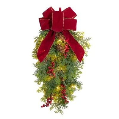 Add a beautiful Christmas swag to the back of any chair. This chairback swag features an assortment of PE/PVC lush, mixed greenery, faux berries, and real pinecones. Pre-lit with 15 warm white LED lights, this swag shines brighter than most and has a countdown timer function that runs 6 hours on and 18 hours off. The PE/PVC mixed greenery (45% PVC/ 10% PE) blend features 31 tips and comes with a velvet-covered hook for easy hanging on either the back of a chair or staircase railing. A beautiful weather-safe red velvet bow is the finishing touch to this Chairback Swag. Requires 3 AA batteries – not included. Perfect for indoor and outdoor use, Measures 14 inches Wide x 4 inches Deep x 20 inches High and Weighs 1 pound.