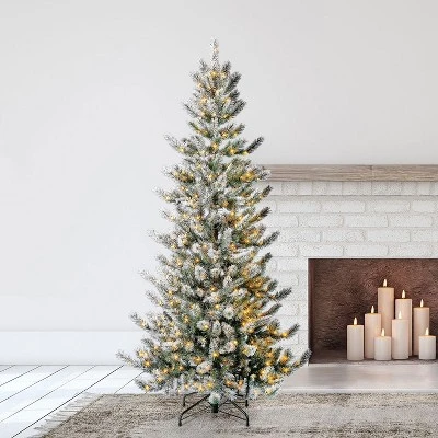 - HOLIDAY ESSENTIAL: Bring holiday cheer into your home with this Natural Pine 7′ Flocked Prelit Artificial Christmas Tree with clear LED lights and 647 foliage tips