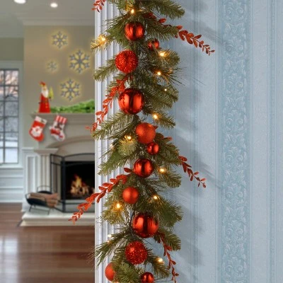 The Christmas Red Mixed garland is part of the Decorative Collection line of holiday decorating ideas. This mixed tip garland features red and green leaf sprigs and both matte and shiny red ball ornaments. It is pre-strung with 50 battery-operated warm white LED lights that are energy-efficient and long lasting. 6 hours ON/18 hours OFF timed operation. This garland can be displayed over doors, windows, fireplace mantels, fence, or stairway railings in indoor or covered outdoor locations.