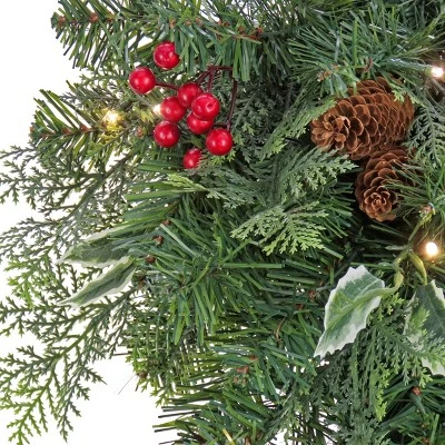 - This fantastically festive artificial plant swag lights up and features red berries and pinecones