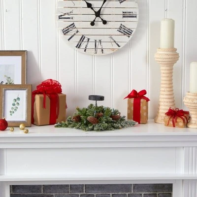 Set your home aglow this holiday season with the help of this artificial candelabrum; specifically designed as an elaborate candle holder, it’s intricately designed from a rich overgrowth of realistic looking pine greenery, handsomely accented with miniature faux pinecones, all carefully surrounding a candle holder. Better yet, this seasonal centerpiece comes already pre-strung with 35 multicolored lights and a light frosting of fake snow, eliminating unsightly messes and holiday stress. Reaching 16” long, this winter-ready decorative accent would make a snowy addition to a mantle or a holiday-inspired tablescape. Silk arrangements are manufactured using synthetic materials, such as polyester material or plastic, and are well designed and constructed to be life-like in appearance. This item will need to be re-shaped when removed from the secure box to allow it to reach its fullest size. Your artificial arrangement will look beautiful for years to come; simply wipe clean with a soft dry cloth when needed.