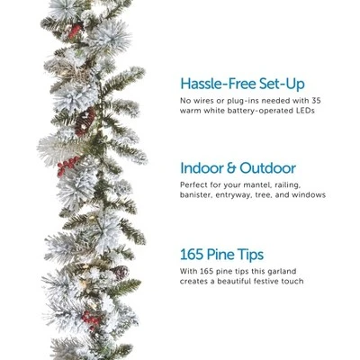 Bring the wonder of the holiday season to your home with the NOMA Snow Dusted Berry 9-Foot Artificial Christmas Garland. With realistic foliage and bright lights, this holiday garland brightens the room and brings in the holiday cheer.Place this Christmas holiday decoration inside or outside your home, year after year. Each strand of artificial garland measures 9 feet long. With 162 PE and PVC snow-dusted pine needles of various greens and varying depths, this holiday garland features a charmingly realistic look. Mini life-like berries and pinecones decorate the space between the needles. This pre-lit Christmas garland also features 35 bright warm white LED lights that give the holiday decoration a cheerful glow. The holiday garland with warm white lights is battery-powered for convenience, so there’s no power cord to worry about.With its easy-to-use battery-operated design, this artificial Christmas garland is easy to hang and display indoors and outdoors. Enjoy the holiday cheer with the NOMA Snow Dusted Berry LED Artificial Christmas Garland.