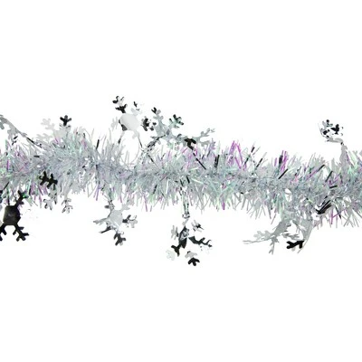 Nothing says holiday like a good old-fashioned tinsel garland! This blue and silver garland is accented with silver snowflakes and will add shine and sparkle to any holiday decor. Perfect to decorate trees, mantles, and railings.Product Features:Designed with thin white Iridescent and shiny silver strandsSilver snowflakes accents throughoutUnlit Flame retardant Tarnish resistant For indoor use or covered outdoor useDimensions: 12′ long x 3″ wideMaterial(s): tinsel