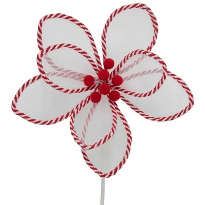 Add a touch of holiday magic to your decor with this candy cane poinsettia holiday stem. Its clear mesh petals are beautifully accented with a festive red and white striped edge, making it the perfect addition to your holiday arrangements, wreaths, or centerpieces. Brighten your home with this enchanting holiday accent today.Product Features:Red and white candy cane poinsettia sprayMesh petals create a light and airy feelEach petal is accented with a red and white striped edgingBendable wire in the petals for perfect positioningDouble wrapped white stem for stabilityDimensions: 22″ high x 10″ in diameterMaterial(s): mesh/yarn/felt/wire