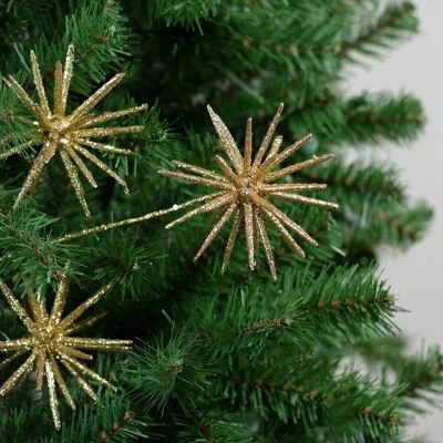 Implement a bedazzled theme to your holiday decor with this festive glitter starburst spray. Its sparkling accents will add a touch of shine and is perfect for elegant decor. You can add this spray to any floral arrangement or place in your holiday tree this holiday season!Product Features:Shiny golden starburst artificial holiday sprayInclude three silver star ballsSpray is embellished with bright yellow gold glitterBendable golden glittered stem and branchesRecommended for indoor use or outdoor covered useDimensions: 24″H x 7″W x 4″DMaterial(s): plastic/wire/glitter