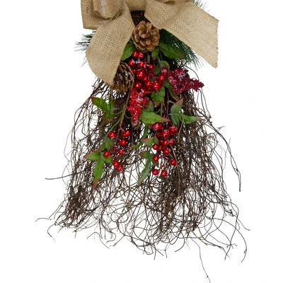 Add some rustic flair to your holiday decor with this stunning swag. Featuring long twigs, pine sprigs, pine cones, and red berries, sprinkled with a dusting of faux ice crystals. A burlap bow ties the swag together making it the perfect show stopper. Ideal for doors, walls, or as part of your holiday table centerpiece.Product Features:Twig and pine sprig holiday swagAccented with pine cones and berriesLarge burlap bow finishes swagNo assembly required – swag comes in 1 piece Sturdy twig base and loop for easy hanging – hardware not included Recommended for indoor useDimensions: 24″H x 6.5″W x 5″DMaterial(s): twigs/pine cones/plastic/foam/fabricNote: Branches are compressed for shipment, and need to be fluffed out upon arrival to look like the photo.