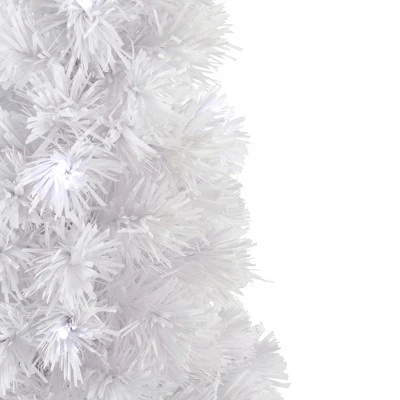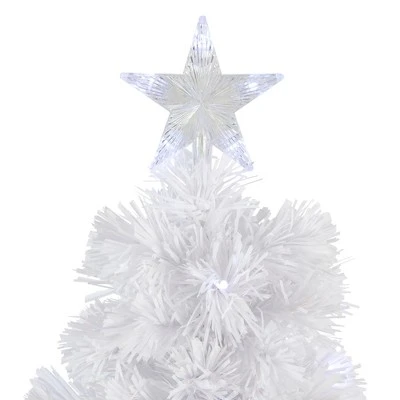 Look at this beautiful fiber-optic white holiday tree, perfect for any holiday decor! The tree features multi-colored lights, a lighted star on top with a silver bottom base that reads “Merry holiday”. You can place this piece on your end table, mantel, or even make this tree your child’s own first holiday tree.Product features: Pre-lit fiber optic tree has a multi-color wheel at baseFiber optic colors include: red, green, amber, pink and clearTree also comes with cool white LED lightsBulb size: concave wide angle2.5″ wide branch tipsIncludes an attached silver tree stand with an on/off switchThe tree stand plugs into the tree, lighting the topper and LED lightsThis stand reads Merry holiday with jingle bells, ribbon, angel, candy cane, stars, and a moonCan be used as a tabletop decorationBranches are bendable to help accommodate your decorating needsAdditional product features:2-piece easy assembly (including stand) UL listed for indoor use only Black adapter included lights up the entire treeAdapter input: 120 volts, 60 hertzAdapter output: 12 volts, 0.12 ampsBlack lead cord is approximately 10′ long Cannot be connected to other lighted itemsDimensions: 3′ high (from the base of the pot to the top of the tree)19″ base diameter (at the widest point)Pot dimensions: 5″ high x 5.5″ wideMaterial(s): PVC/plastic/wire
