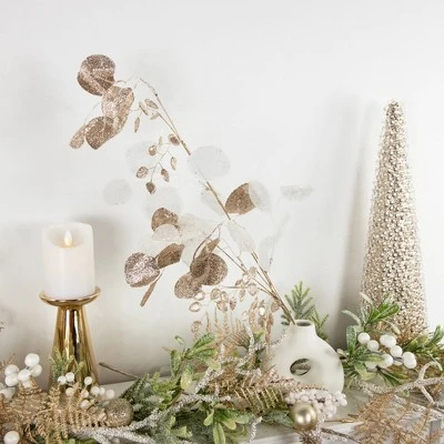 This holiday spray is perfect for vases, adding to decorative floral displays, winter craft projects, or your holiday tree. Create a beautiful dinner table arrangement by combining this spray in a vase with other floral accents. Includes a bendable wire stem for easy positioning. Features:Gold leaves holiday sprayBendable wire for easy positioningPerfect for holiday centerpieces Recommended for indoor use onlyDimensions: 32″ highMaterial(s): plastic/wire