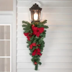 With the hustle and bustle of the Holiday, you may not have enough time to fully decorate your home. This lovely pre-decorated teardrop swag will make this year’s decorating a breeze. Perfect for hanging on doors, over thresholds, or add candles and create a unique table decorationProduct Features:Unlit2″ wide tipsBendable wire branches allow for you to easily shape the swag and accommodate your decorating needsLoop hook at the top for easy hangingFor indoor use onlyNo assembly required – swag comes in 1 piece Dimensions: 32″ long x 14″ wide (at the widest point)Material(s): PVC/foam/plastic/metal/fabric/pine conesNote: Branches are compressed for shipment, and need to be fluffed out upon arrival to look like the photo.