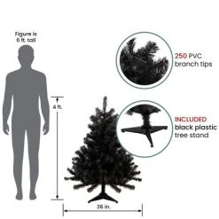 This unique tree is perfect for taking Halloween decorations up a notch or a chic modern approach to your holiday decor. Impress your family and friends with this black Colorado Spruce that is easily put up and taken down with its hinged branch construction. The tree features no lights so that you can decorate it to your specifications. This tree is durable and beautiful enough to use year after year even with the ever-changing trends. Product Features:Unlit250 tips2″ wide tapered tipsFull profile treeHinged branch constructionRecommended for indoor use only3-piece easy assembly (including stand)Comes with a free black plastic tree standDimensions: 4’ high (from the base of the stand to the top of the tree)36” base diameter (at the widest point)Material(s): PVC/metalNote: Branches are compressed for shipment, and need to be fluffed out upon arrival to look like the photo.