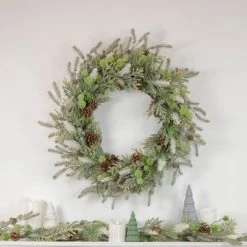 Add a touch of nature to your holiday decor with this frosted pine cone garland. It is designed with silver glittered pine leaves, burrs, and pine cones. Whether draped along your mantel, staircase, or used as a centerpiece, it adds a touch of elegance and holiday charm to any space. Embrace the magic of the season with this stunning winter-inspired garland.Product Features:UnlitComes with glitter accentsBendable wire center allows for you to shape the garland any way you desireFor indoor use onlyDimensions: 5’ long x 10″ wideMaterial(s): plastic/metal/glitter/wood