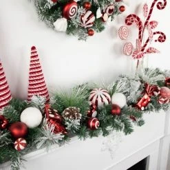 - Flocked And Decorated Red And White Christmas Pine Garland