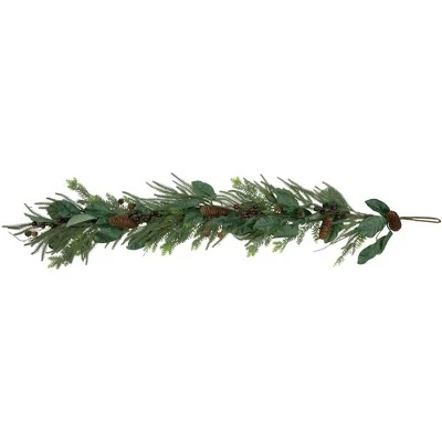 Add some green to your mantelpiece with this gorgeous mix foliage garland. Its foliage branches decorated with pine cones and berries are sure to bring your holiday decor together. Add holiday lights and small holiday ornaments for a festive holiday decoration.Product Features:UnlitAccented with green mixed foliage, magnolia leaves, pine cones and berriesA bendable wire center allows you to shape the garland any way you desireBrown metal loops on each end for easy hangingRecommended for indoor use only Dimensions: 6’ long x 10″ wideMaterial(s): plastic/wire