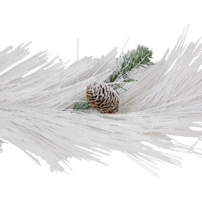 Add some winter wonder to your mantelpiece with this gorgeous, flocked pine garland. Its traditional branches are sure to bring your holiday decor together. Inspire envy with its unlit body, allowing you to decorate it as you wish.Product Features:UnlitAccented with pineconesFor indoor use onlyBendable wire center allows you to shape the garland any way you desireComes ready to hang with bendable metal loops on each endDimensions: 10″ wide x 6′ longMaterial(s): PVC/metal/woodNote: Branches are compressed for shipment, and need to be fluffed out upon arrival to look like the photo.