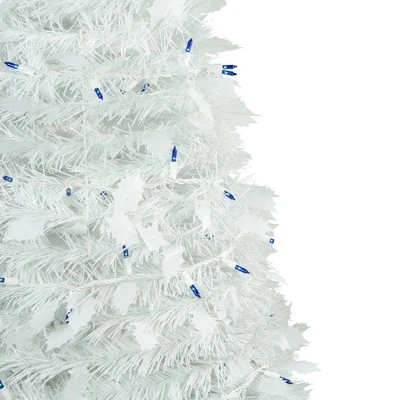 This “pop-up” tree has a collapsible design, which allows it to be set up in seconds. The tree comes pre-strung with blue, incandescent mini lights, making the setup a breeze. Perfect for apartments, dorm rooms, or families who want to relax and enjoy the holiday without the hassle.Product features:Pre-lit with 250 blue lightsBulb size: miniBulb type: incandescent21″ white lead cordWhite inner poleHolly leaf accentsEasy pop-up assemblySlim profile treeAdditional product features:Light sets on tree are UL certified and approved for indoor or outdoor use, however, the tree itself is recommended for indoor use onlyIf one bulb burns out, the rest will stay litLights are equipped with Lamp Lock feature, which makes them replaceable, interchangeable and keep them from falling outComes with replacement bulbs and spare fuseIncludes a white plastic tree standWire gauge: 22120 volts, 60 hertz, 0.51 amps, 61.2 wattsDimensions: 6′ high (from the base of the stand to the top of the tree)22″ base diameter (at the widest point) Material(s): PVC/metal/glass bulbs/wire/plastic