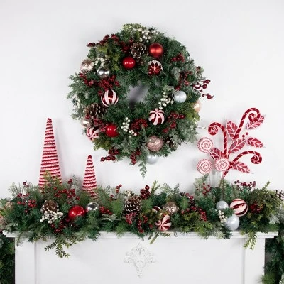 Add some green to your mantelpiece with this gorgeous mix foliage decorated garland. Its foliage branches decorated with pinecones and holiday ornaments are sure to bring your holiday decor together. This festive garland includes a bendable wire center and metal loops on each making decorating for the holidays a breeze.Product Features:UnlitAccented with mixed foliage, pinecones, red, white and peppermint holiday ball ornaments and berriesA bendable wire center allows you to shape the garland any way you desireMetal wire loops on each end for easy hangingRecommended for indoor use only Dimensions: 7’ long Material(s): plastic/wire/pinecone