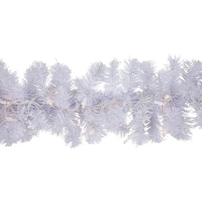 Make your home a holiday paradise this holiday season. It features white needles with 220 tips creating the perfect, lush winter wonderland effect. This gorgeous garland is perfect for your mantle and thresholds. Product Features: Pre-lit with 50 clear lights 220 tips 2″ – 2.5″ wide tips8″ white lead cord Additional Product Features: Light sets on the garland are UL listed for indoor or outdoor use, however, the garland itself is recommended for indoor use If one bulb burns out, the rest will stay lit Lights are equipped with a Lamp Lock feature, which makes them replaceable, interchangeable and keeps them from falling out Contains end-to-end connectors which allow you to connect multiple lighted items (not to exceed 210 watts)Bendable wire center allows you to shape the garland any way you desire Metal hooks on each end for easy hanging Comes with replacement bulbs and spare fusesWire gauge: 22120 volts, 60 hertz, 0.34 amps, 40.8 watts Dimensions: 9′ long x 10″ wide Material(s): PVC/metal/glass/wireNote: Branches are compressed for shipment, and need to be fluffed out upon arrival to look like the photo.