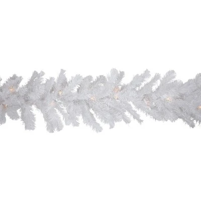 This garland would be a perfect accent on your mantelpiece or along a railing. With it’s clear lights it will emit a warm glow over your holiday decor. A perfect accent for a door or wall to add a bit of dimension and holiday cheer!Product Features:Pre-lit with 50 clear mini lights200 tips1.75” wide tapered tips30” white lead cord Additional Product Features:Super bright bulbsRecommended for indoor use onlyIf one bulb burns out, the rest will stay litBendable wire center allows for you to shape the garland any way you desireMetal hooks on each end for easy hangingFlame retardantUL listed for indoor or outdoor useContains end-to-end connectors allows you to connect multiple garlands together (not to exceed 210 watts)Comes with replacement bulbs and spare fuseWire gauge: 22120 volts, 60 hertz, .17 amps, 20.4 watts Dimensions: 9’ long x 12″ wideMaterial(s): PVC/glass bulbs/wire/metal