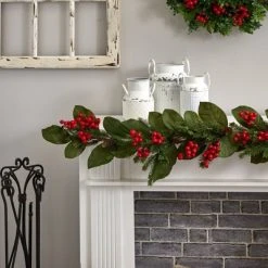 Nearly Natural 5' Pine with Magnolia Flowers and Berries Artificial Christmas Garland Green