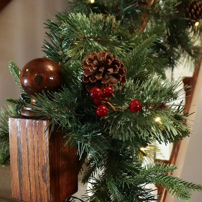 Deck the halls this holiday season with this pre-lit artificial Christmas garland. Decorated with lifelike pinecones and red holly berry clusters, this green decorative garland is sure to add holiday charm to any holiday display in the living room, in the kitchen, on the porch, or on the deck. This decorative garland is great for any holiday or winter display. Keep it up all winter long for a natural, festive touch anywhere. With realistic PVC and polyethylene branch tips, this Christmas decoration is designed for indoor use year after year. Let the 50 warm white LED lights illuminate your home with a soft twinkle and cheer this holiday season. The lights are powered by 3 AA batteries (batteries not included) and can be automatically controlled with the timer on the battery box. Tuck the battery box into the full branch tips to conceal it from sight during display.