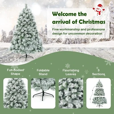 Our artificial Christmas tree is crafted with 100% new PVC materials, which are more vivid color and better texture than cheap tree adopting recycled materials. Snow flocked needles and green branch tips, all deliver stronger aesthetic vision impact to increase the festive effect. It is fairly easy for anyone to assemble the Christmas tree thanks to the convenient hinged sections. More, sturdy metal base keeps the tree as stable as possible, unlikely to fall over. You can place a selection of ornaments to decorate the Christmas tree with your family for a wonderfully festive effect. Let the enchanting smell of the holidays encompass your every room!