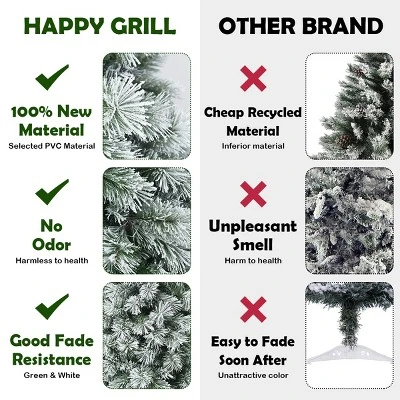 - Flocking Snow Branches: This Christmas tree is composed of 586 PVC branches and pine needles. 2 different types of branches make this tree look more real. Covering the dense branches with a layer of snow, you can feel the atmosphere of winter even indoors, creating a snow-white Christmas.
