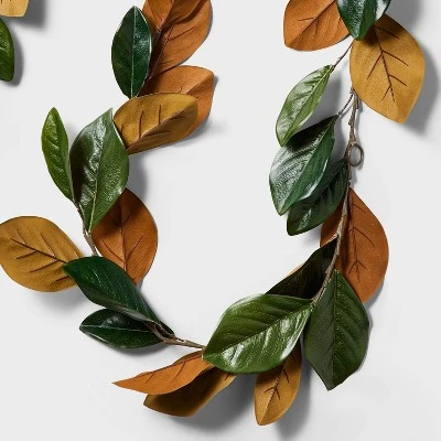 Add a natural texture and look to your seasonal decorations with this XL Magnolia Leaf Garland from Threshold™ designed with Studio McGee. This artificial Christmas garland features an arrangement of overlapping magnolia leaves in green and fall-themed colors. Drape the garland on the fireplace mantel or display on a wall or door frame inside your home.