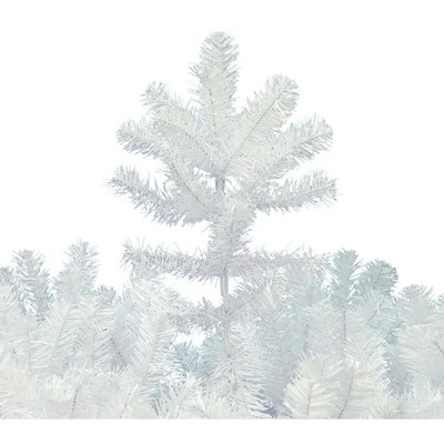 Vickerman Crystal White Artificial Christmas Tree with PVC Tips. A wonderful alternative to the traditional green Christmas tree, this brilliant tree has white PVC tips on metal hinged branches, and a tree stand is included.