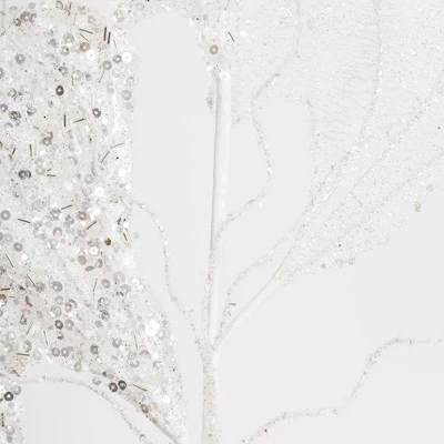 Vickerman 20″ Fiddle Leaf Glitter Aritificial Christmas Spray. This spray features a mix of mesh and eye-catching glitter accented foliage. This beautiful spray is made of durable polyester, and has a paper wrapped wire stem. Includes 3 pieces per bag.