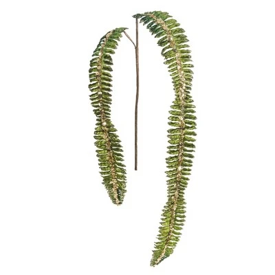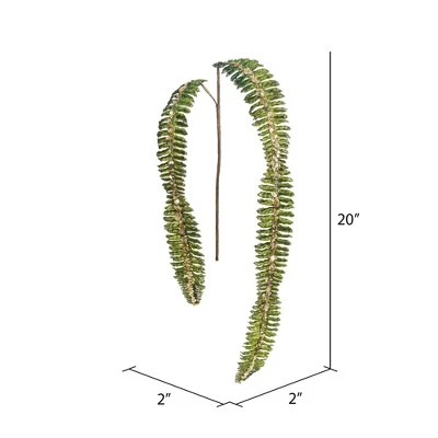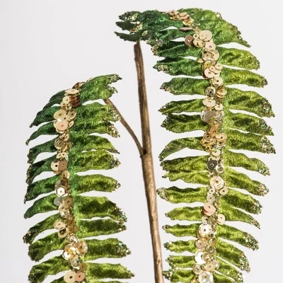 Vickerman 20″ Green Fern Glitter Aritificial Christmas Spray. This fern spray features 2 hanging fronds with eye-catching Glitter accents. This beautiful spray is made of durable polyester, and has a paper wrapped wire stem. Includes 3 pieces per bag.